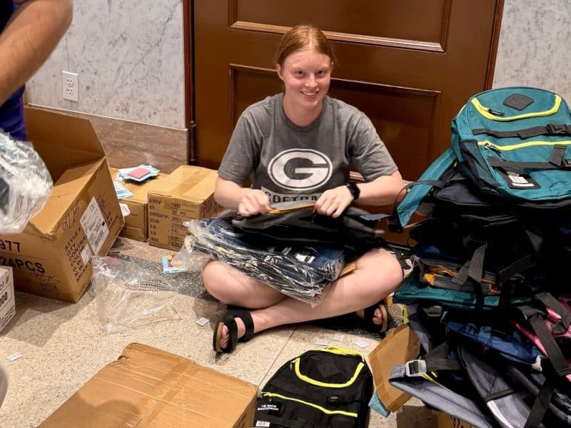 Teen volunteers from the Bay Area Community Foundation stuff backpacks with school supplies to empower students to start the academic year on a good note.
