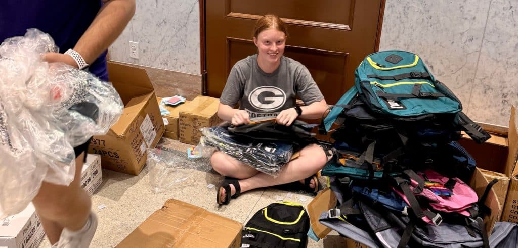 The project has the teens collecting school supplies and then filling 500 backpacks. Pulling it off requires teamwork, leadership, organization, and all-hands-on-deck assembly line to get the bags packed and distributed before school starts.